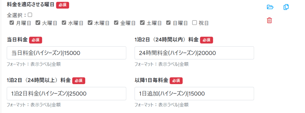 - 料金設定3:「料金を適応させる曜日:月~金にチェック」、「ラベル:平日料金」、「料金:2,000円」